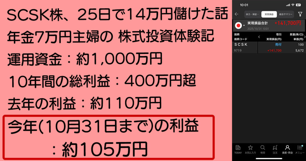 タイトルの通り、SCSK株でたった25日間で14万円以上の利益が出たんです!